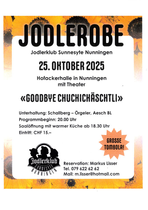 Für Samstag 25. Oktober 2025 möchten wir alle unsere Freunde und Bekannten zu unserem traditionellen Jodler-Obe mit Theater einladen.
